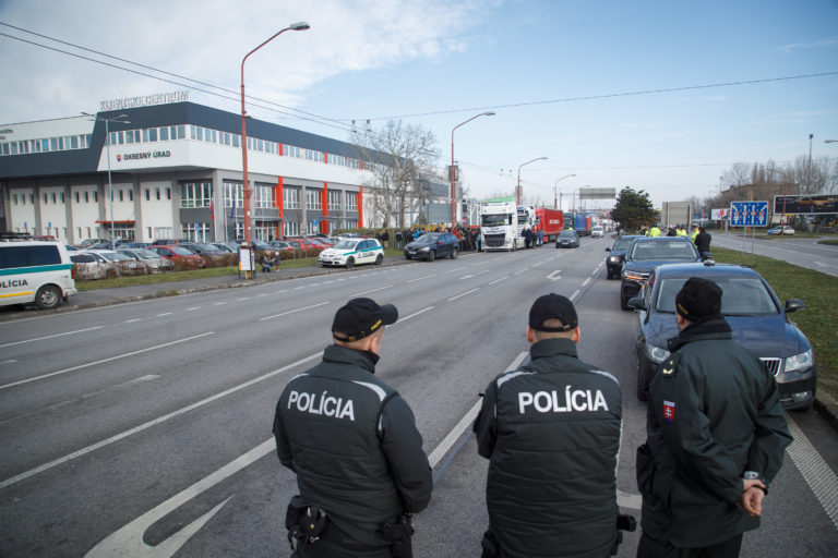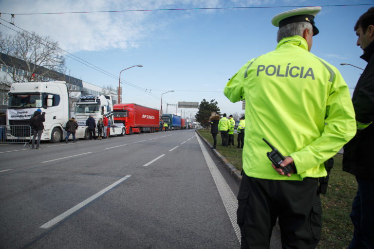 Účastníci štrajku s kamiónmi na Tomášikovej ulici počas štrajku zástupcov Únie autodopravcov Slovenska (UNAS) proti daňovému zaťaženiu. Foto: SITA/Branislav Bibel