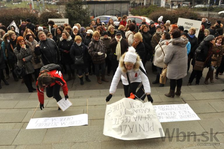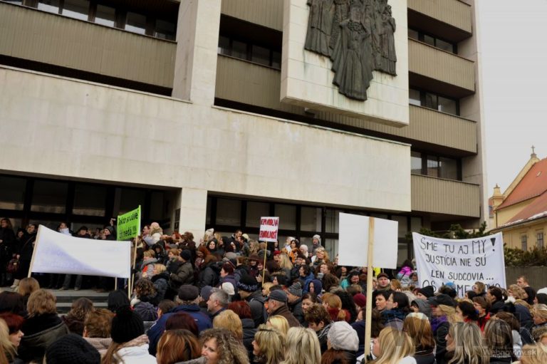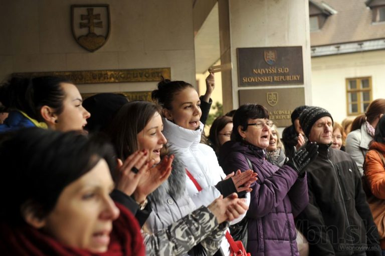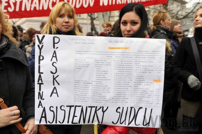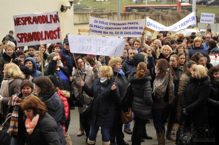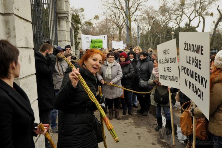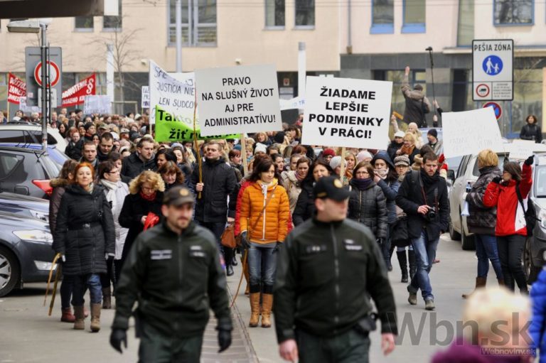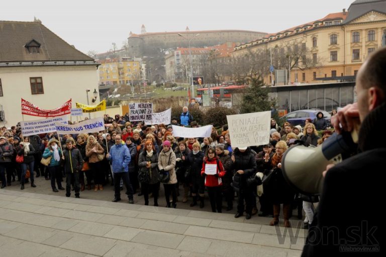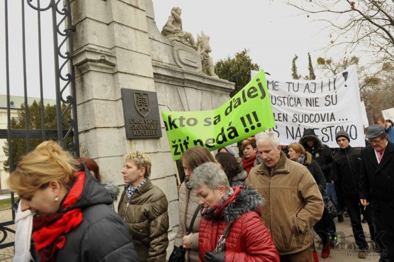 Účastníci protestu pred Úradom vlády SR počas jednodňového výstražného štrajku zamestnancov okresných a krajských súdov v SR pre zlú sociálno-ekonomickú situáciu v rezorte MS SR. Bratislava, 19. február 2015. Foto: SITA/Ján Slovák