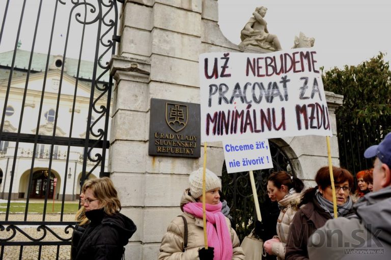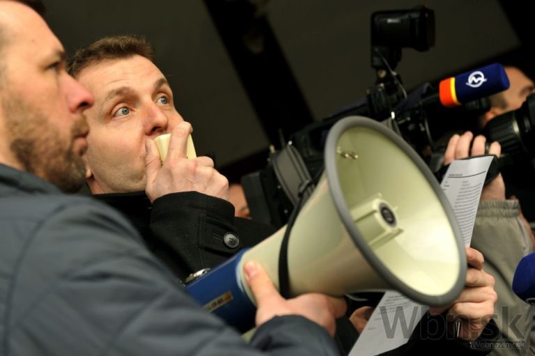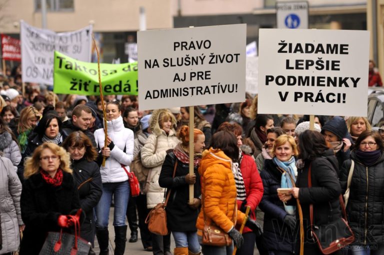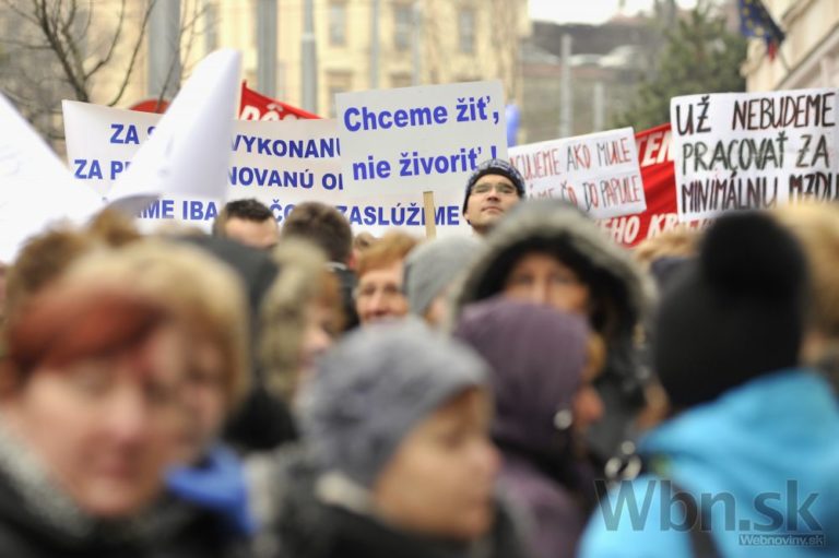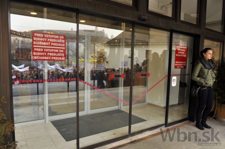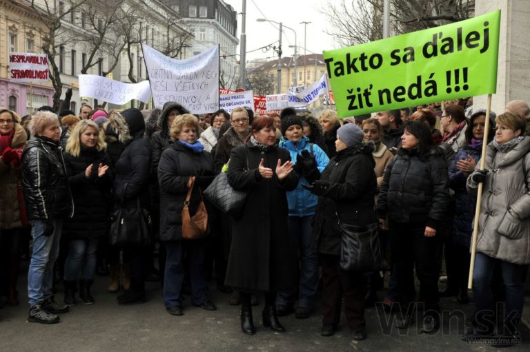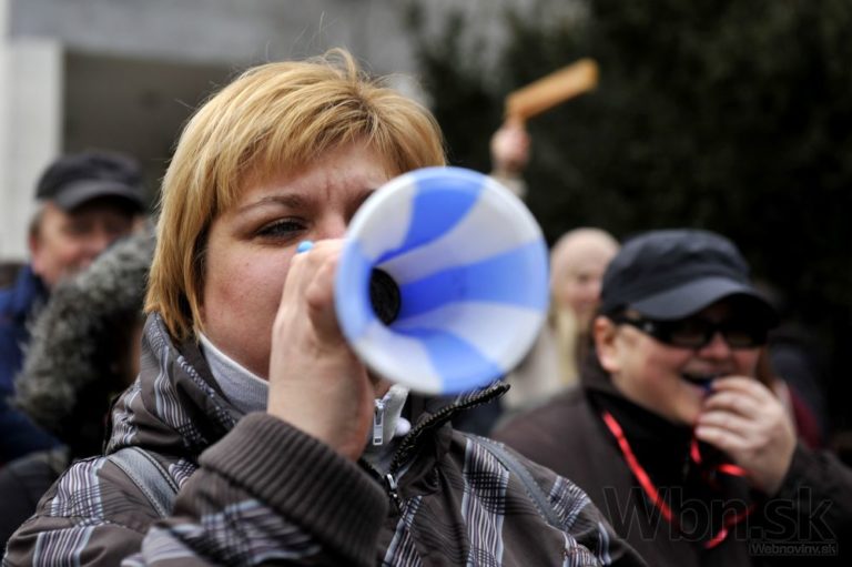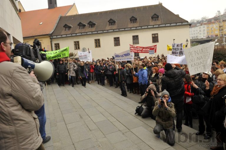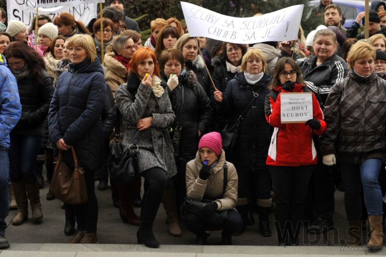 Účastníci protestu pred Úradom vlády SR počas jednodňového výstražného štrajku zamestnancov okresných a krajských súdov v SR pre zlú sociálno-ekonomickú situáciu v rezorte MS SR. Bratislava, 19. február 2015. Foto: SITA/Ján Slovák