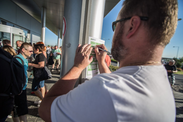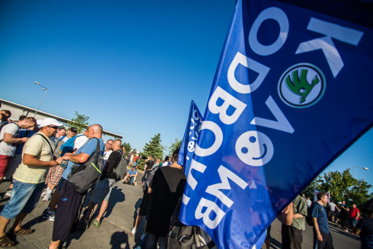 Transparenty počas štrajku v automobilke Volkswagen. Bratislava, 20. jún 2017. Foto: SITA/Marko Erd