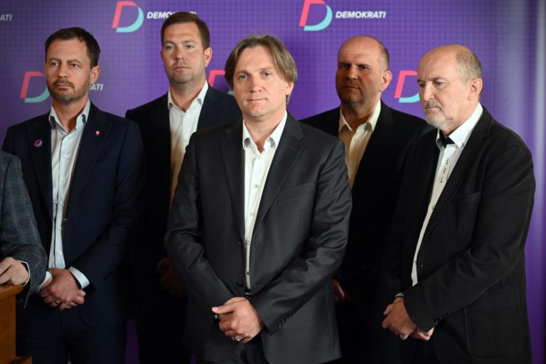 Zľava, členovia strany Demokrati: Dočasne poverený predseda vlády SR Eduard Heger, Jozef Sýkora, Ján Šubák, Martin Javorček a Karol Achimský počas tlačovej besedy na tému: Predstavenie nových posíl strany Demokrati, v Banskej Bystrici. Banská Bystrica, 1. máj 2023. Foto: SITA/Jakub Julény.