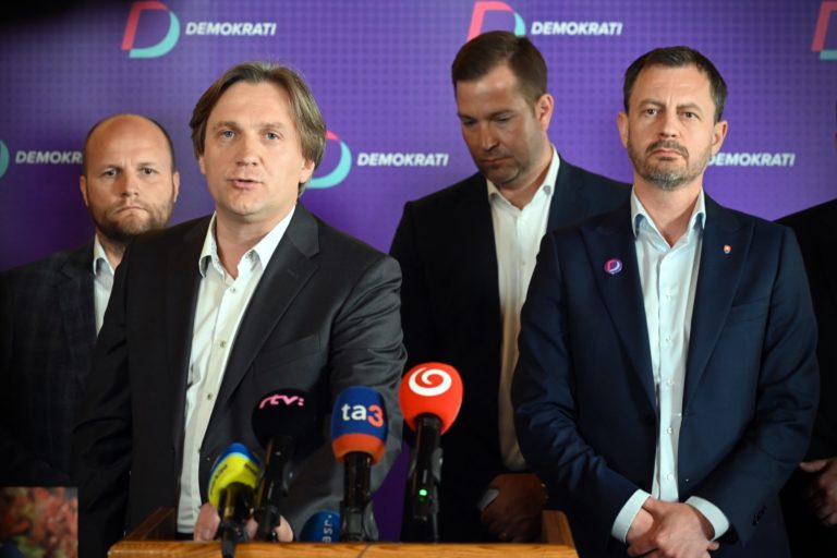 Zľava, členovia strany: Dočasne poverený minister obrany Jaroslav Naď, Ján Šubák, Jozef Sýkora a dočasne poverený predseda vlády SR Eduard Heger počas tlačovej besedy na tému: Predstavenie nových posíl strany Demokrati, v Banskej Bystrici. Banská Bystrica, 1. máj 2023. Foto: SITA/Jakub Julény.