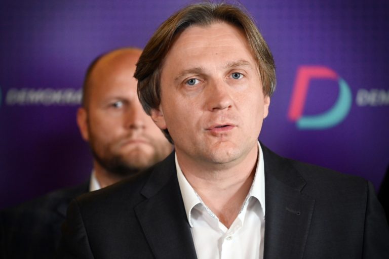 Sprava, členovia strany Demokrati: Dočasne poverený minister obrany SR Jaroslav Naď a Ján Šubák počas tlačovej besedy na tému: Predstavenie nových posíl strany Demokrati, v Banskej Bystrici. Banská Bystrica, 1. máj 2023. Foto: SITA/Jakub Julény.