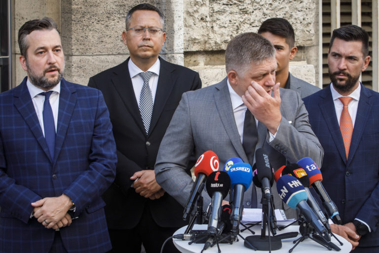 Zľava: Podpredsedovia strany SMER-SD Ľuboš Blaha, Ladislav Kamenický, predseda strany SMER-SD Robert Fico, a podpredsedovia strany SMER-SD Erik Kaliňák a Richard Takáč počas tlačovej besedy strany Smer - sociálna demokracia, v rámci ktorej podali na Generálnu prokuratúru SR trestné oznámenie pre podozrenie zo spáchania zločinu sabotáže. Bratislava, 17. august 2022. Foto: SITA/Branislav Bibel