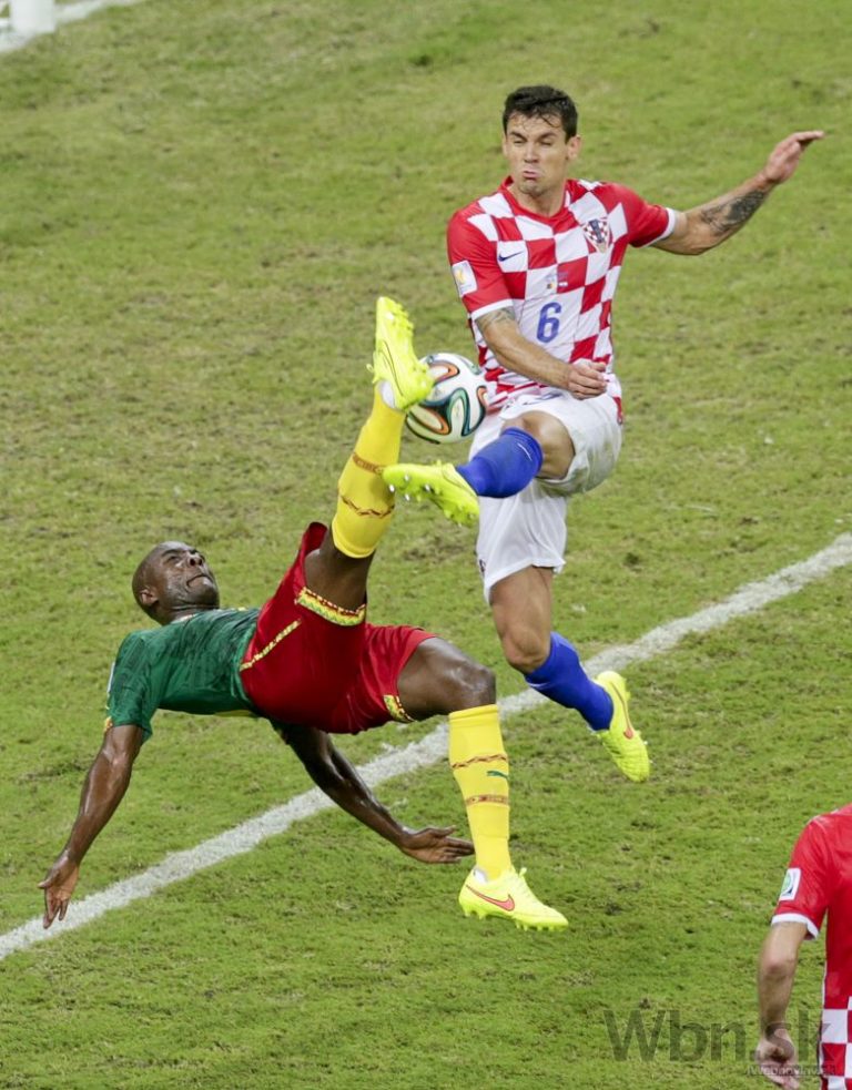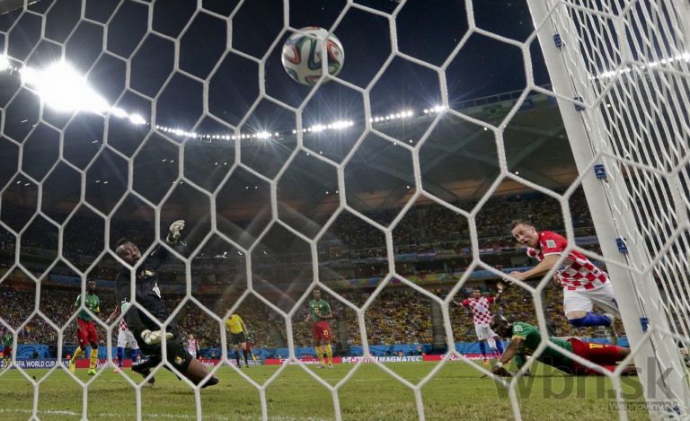Chorvátsky futbalista Ivica OIič prekonáva kamerunského brankára Charlesa Itandjea počas strejdajšieho zápasu A-skupiny na svetovom šampionáte v Brazílii. Foto: SITA/AP
