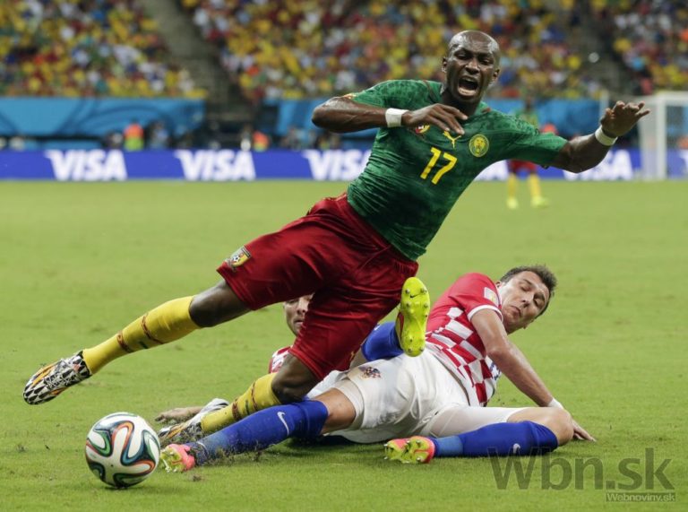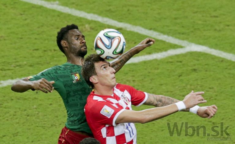 Kamerunčan Stephane Mbia v súboji s chorvátskym futbalistom Mariom Mandzukičom počas stredajšieho zápasu A-skupiny na svetovom šampionáte v Brazílii. Foto: SITA/AP