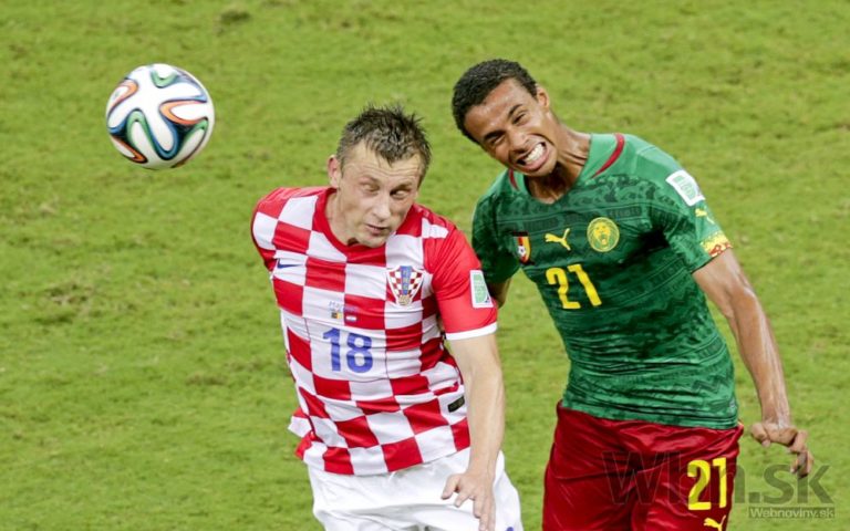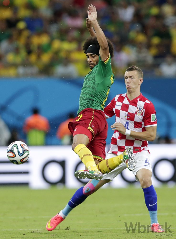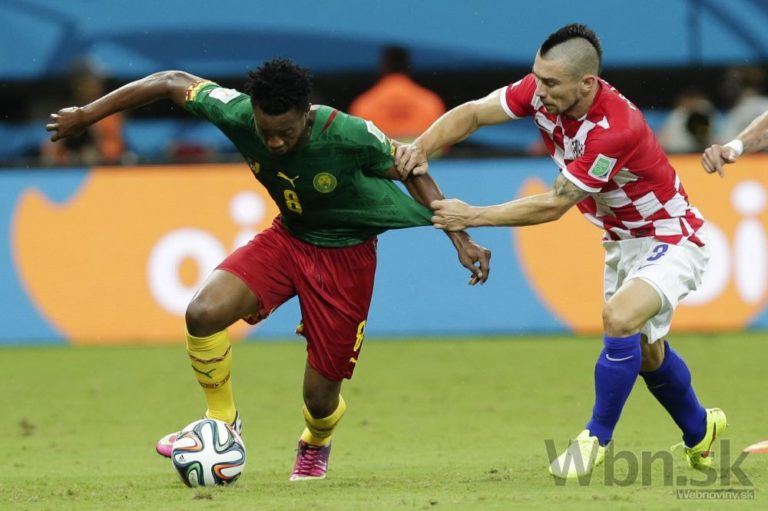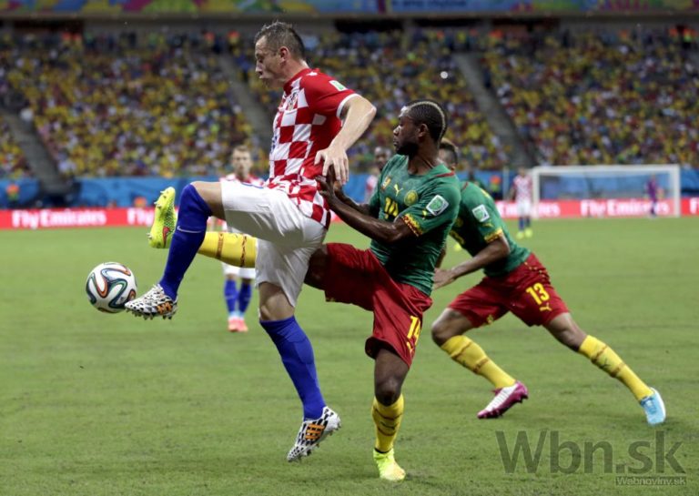 Kamerunčan Benjamin Moukandjo v súboji s chorvátskym futbalistom Danielom Pranjičom počas stredajšieho zápasu A-skupiny na svetovom šampionáte v Brazílii. Foto: SITA/AP