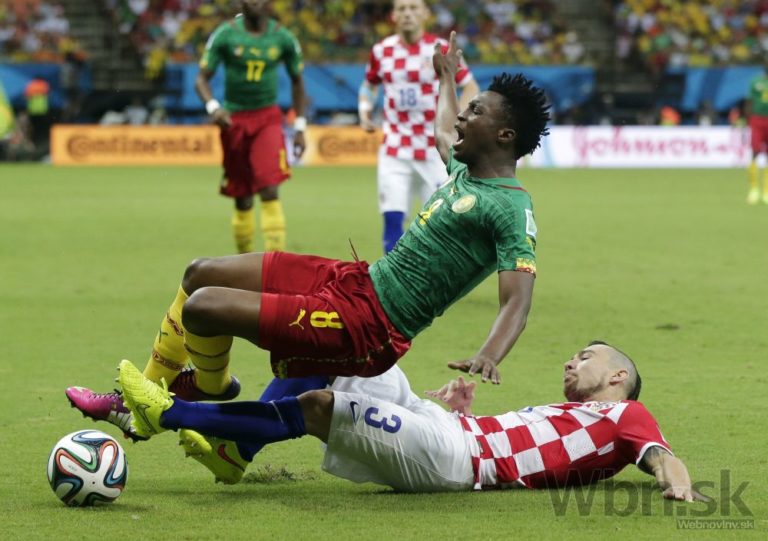 Kamerunčan Edgar Salli padá po súboji s chorvátskym futbalistom Eduardom počas stredajšieho zápasu A-skupiny na svetovom šampionáte v Brazílii. Foto: SITA/AP