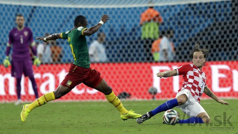 Kamerunčan Benjamin Moukandjo v súboji s chorvátskym futbalistom Lukom Modričom počas stredajšieho zápasu A-skupiny na svetovom šampionáte v Brazílii. Foto: SITA/AP