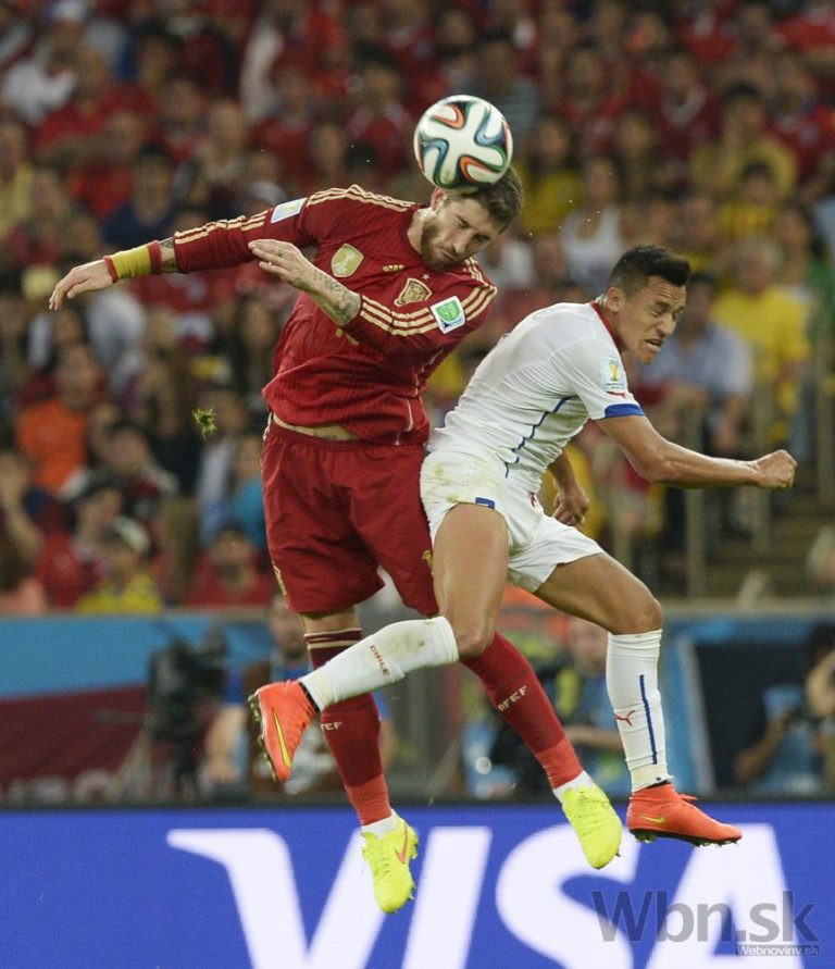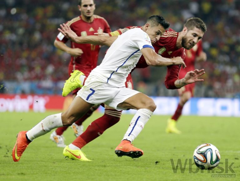 Čiľan Alexis Sanchez v súboji so španielskym futbalistom Sergiom Ramosom počas stredajšieho zápasu B-skupiny na svetovom šampionáte v Brazílii. Foto: SITA/AP