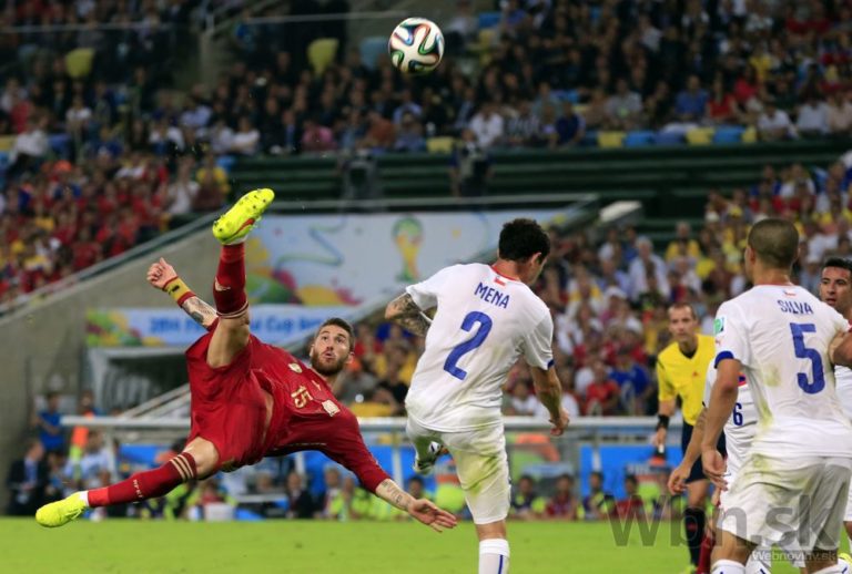 Španielsky futbalista Sergio Ramos strieľa na bránku Čile počas stredajšieho zápasu B-skupiny na svetovom šampionáte v Brazílii. Foto: SITA/AP