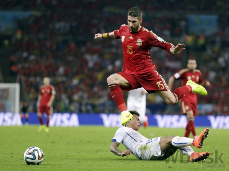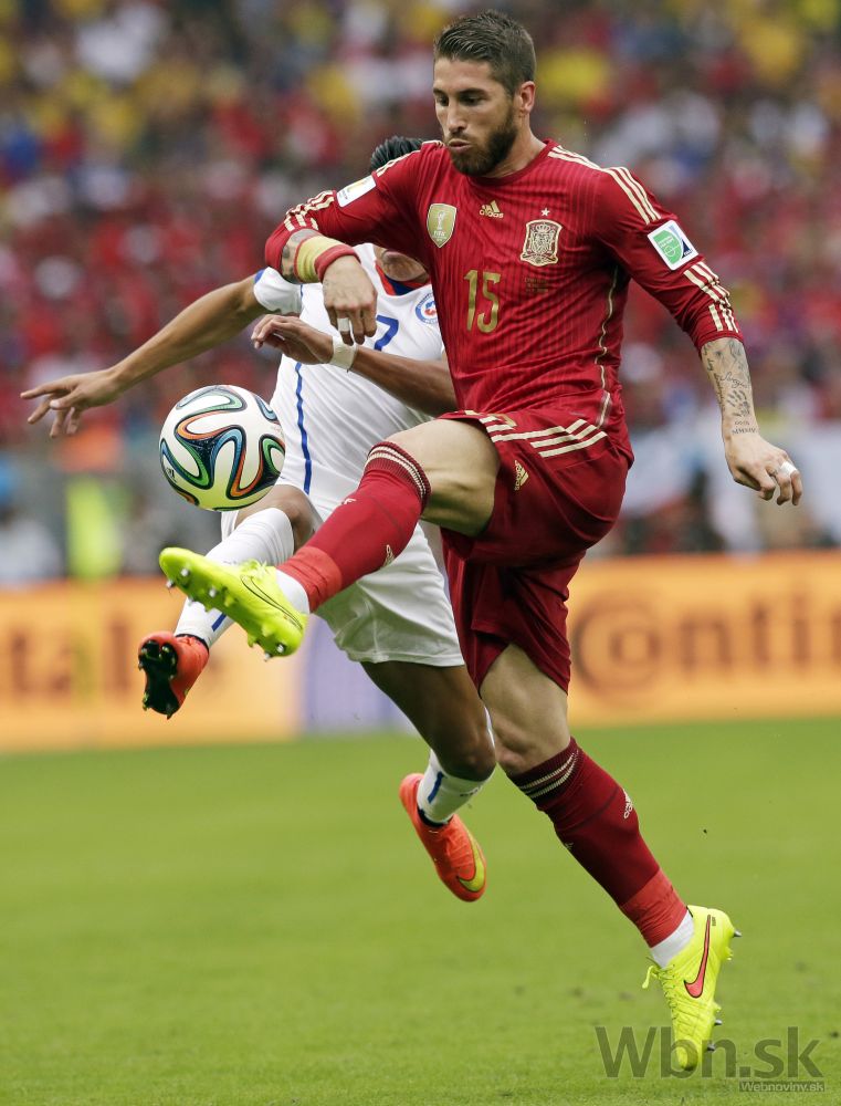 Čiľan Eduardo Vargas v súboji so španielskym futbalistom Sergiom Ramosom počas stredajšieho zápasu B-skupiny na svetovom šampionáte v Brazílii. Foto: SITA/AP