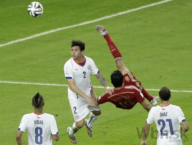 Španiel Diego Costa padá po súboji s čiľskými futbalistom počas stredajšieho zápasu B-skupiny na svetovom šampionáte v Brazílii. Foto: SITA/AP