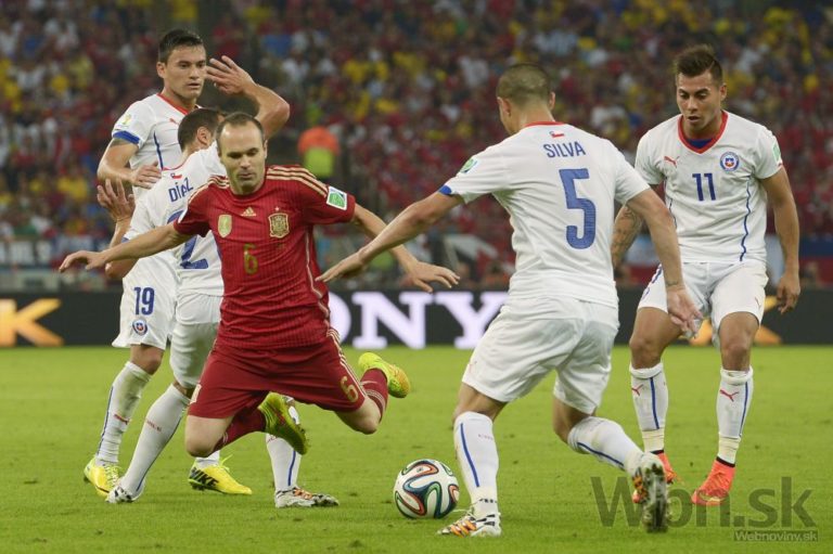 Španiel Andres Iniesta padá po súboji s čiľskými futbalistom počas stredajšieho zápasu B-skupiny na svetovom šampionáte v Brazílii. Foto: SITA/AP