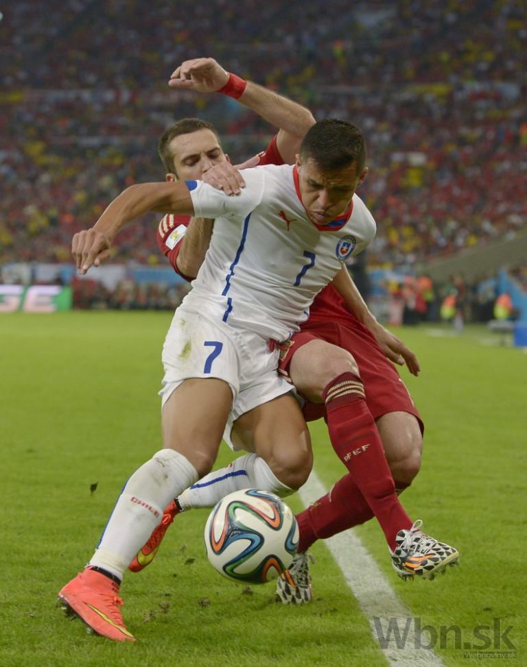 Čiľan Alexis Sanchez v súboji so španielskym futbalistom Jordim Albom počas stredajšieho zápasu B-skupiny na svetovom šampionáte v Brazílii. Foto: SITA/AP