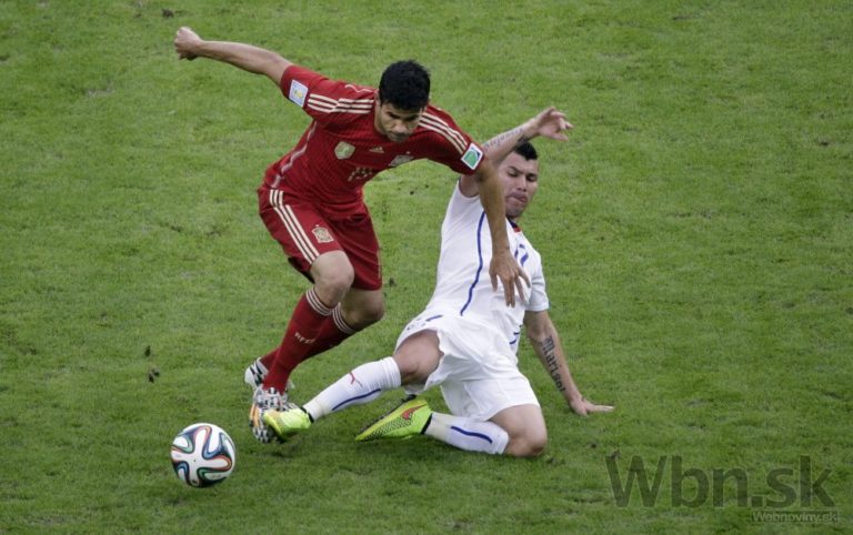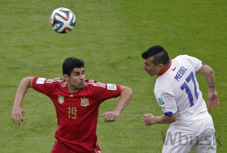 Čiľan Gary Medel v súboji so španielskym futbalistom Diegom Costom počas stredajšieho zápasu B-skupiny na svetovom šampionáte v Brazílii. Foto: SITA/AP