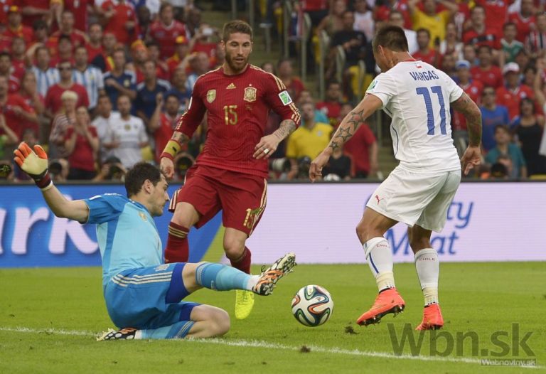 Španielsky brankár Iker Casillas vykopáva loptu pred Čiľanom Eduardom Vargasom počas stredajšieho zápasu B-skupiny na svetovom šampionáte v Brazílii. Foto: SITA/AP