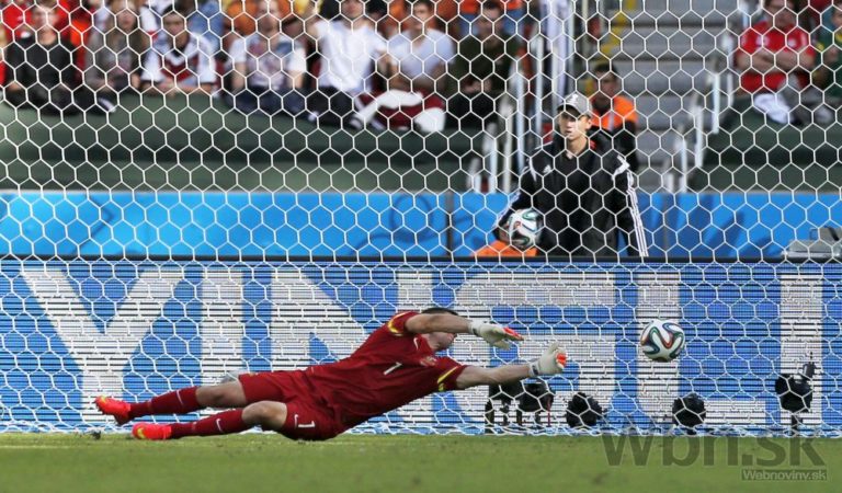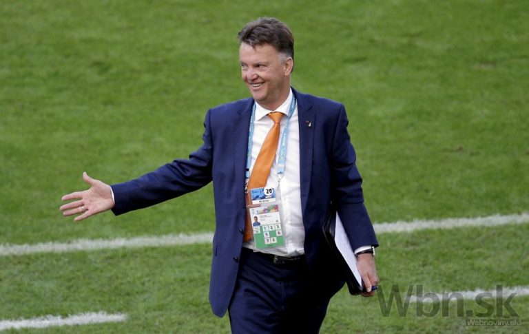 Radosť holandského trénera Louisa van Gaala po tom, ako Arjen Robben strelil jubilejný, 50. gól na futbalových MS v Brazílii. Foto: SITA/AP