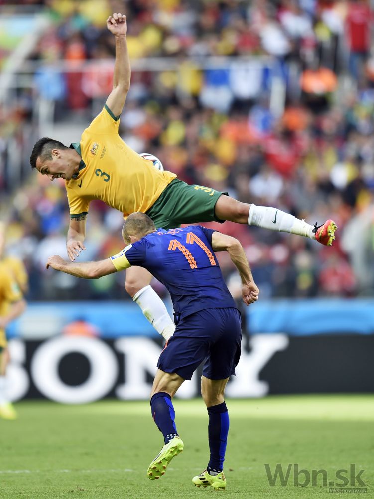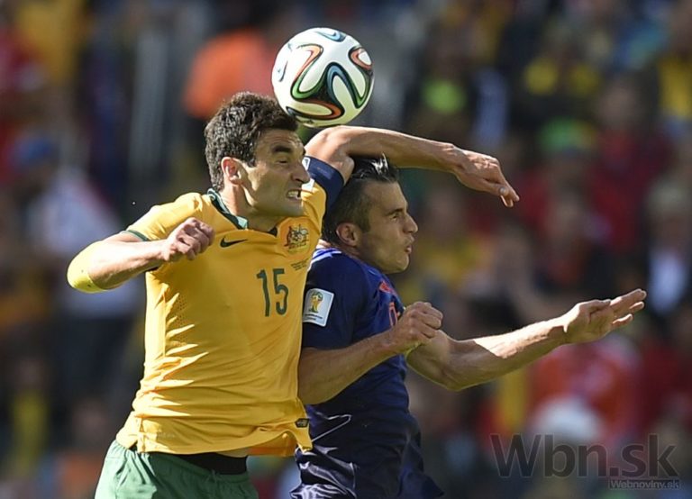 Austrálsky futbalista Mile Jedinak (vľavo) v súboji s Holanďanom Robinom van Persiem počas zápasu B-skupiny na šampionáte v Brazílii. Foto: SITA/AP