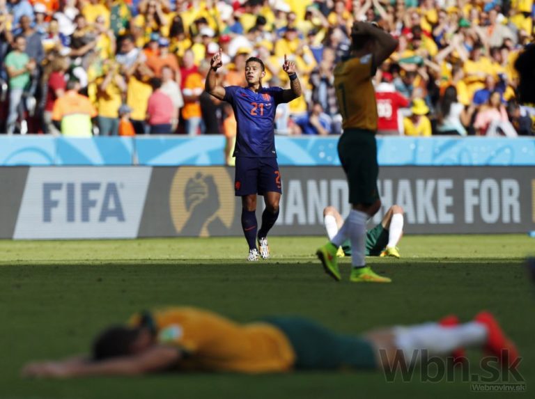 Holandský futbalista Memphis Depay sa raduje z víťazstva nad Austráliou počas šampionátu v Brazílii. Foto: SITA/AP