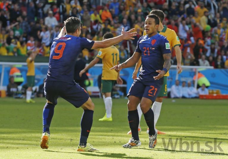 Radosť holandských futbalistov Memphisa Depaya (vľavo) a Robina van Persieho počas zápasu s Austráliou na šampionáte v Brazílii. Foto: SITA/AP