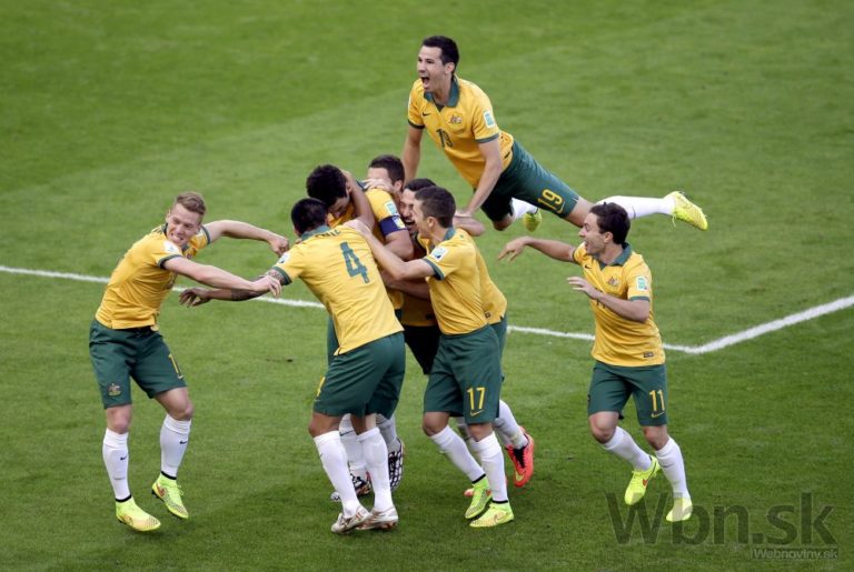 Radosť austrálskych futbalistov počas zápasu B-skupiny na šampionáte v Brazílii. Foto: SITA/AP