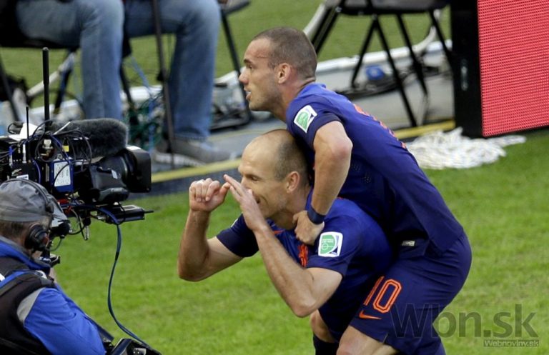 Radosť holandských futbalistov Arjena Robbena (vľavo) a Wesleyho Sneijdera z prvého gólu počas zápasu s Austráliou na šampionáte v Brazílii. Foto: SITA/AP