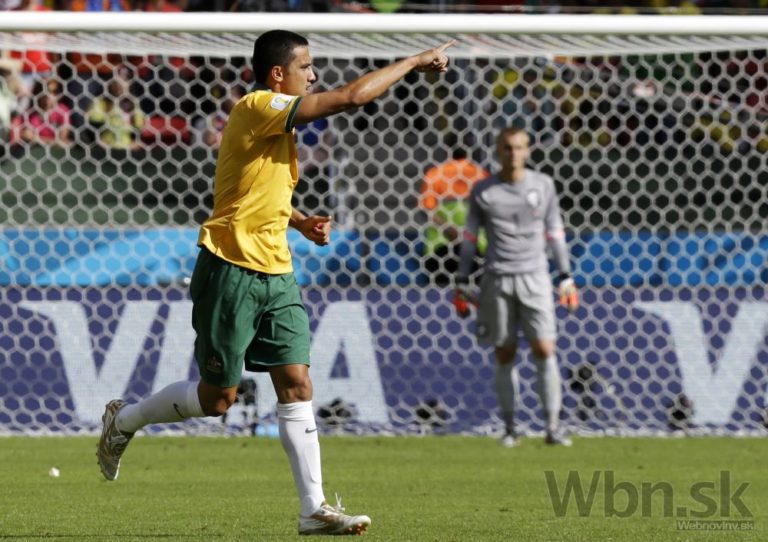 Radosť Austrálčana Tima Cahilla (vľavo) z gólu počas zápasu medzi Holandskom a Austráliou na šampionáte v Brazílii. Foto: SITA/AP