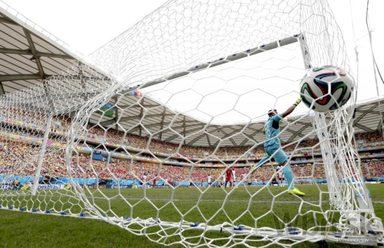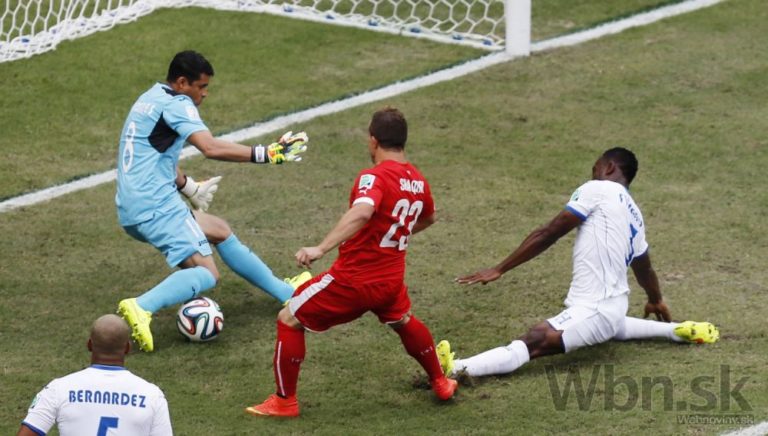 Lopta po strele švajčiarskeho futbalistu Xherdana Shaqiriho končí za chrbtom brankára Hondurasu Noela Valladaresa počas stredajšieho zápasu E-skupiny na svetovom šampionáte v Brazílii. Foto: SITA/AP
