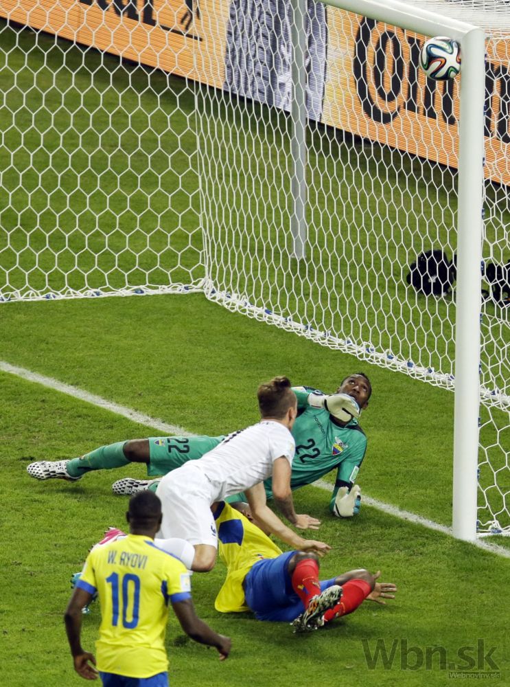 Brankár Ekvádoru Alexander Dominguez vyráža loptu po strele francúzskeho futbalistu Antoina Griezmanna počas stredajšieho zápasu E-skupiny na svetovom šampionáte v Brazílii. Foto: SITA/AP
