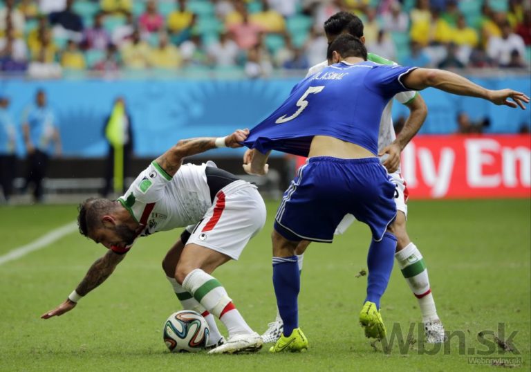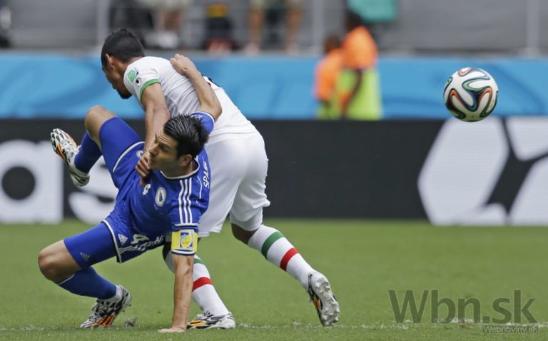 Futbalista Bosny a Hercegoviny Vedad Ibiševič padá v pokutovom území Iránu počas stredajšieho zápasu F-skupiny na svetovom šampionáte v Brazílii. Foto: SITA/AP