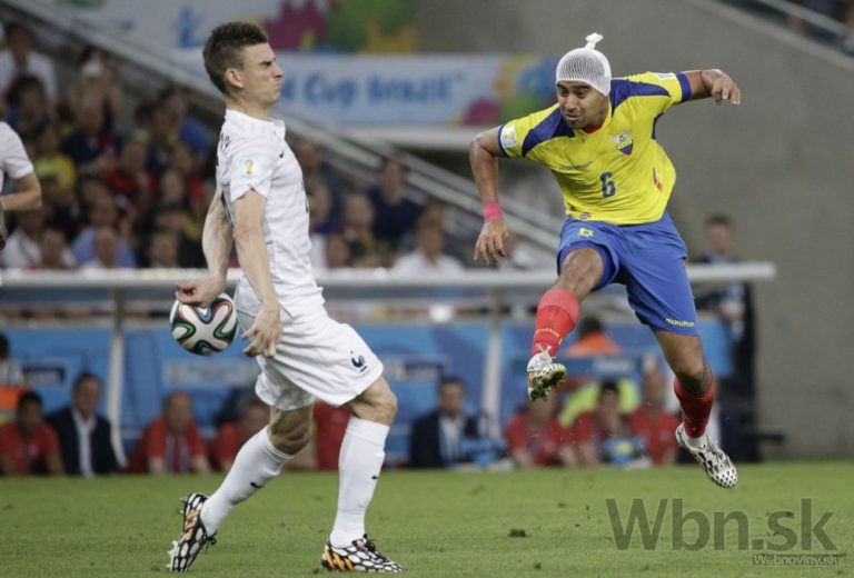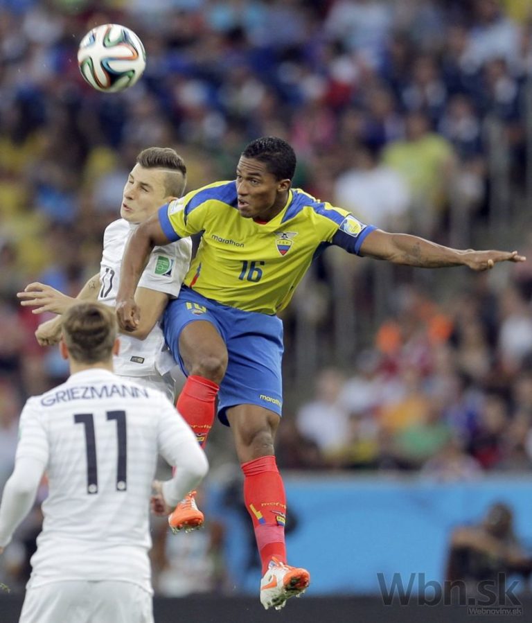 Francúz Lucas Digne v hlavičkovom súboji s ekvádorským futbalistom Antoniom Valenciom počas stredajšieho zápasu E-skupiny na svetovom šampionáte v Brazílii. Foto: SITA/AP