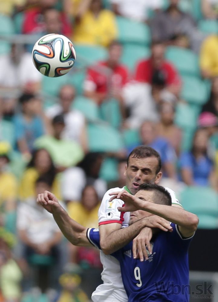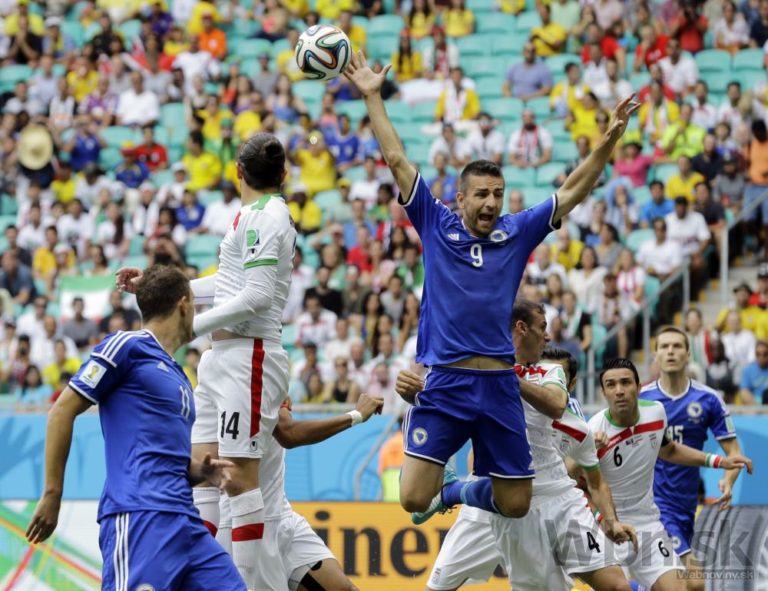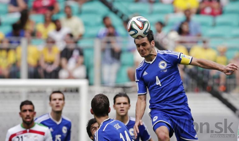 Futbalista Bosny a Hercegoviny Emir Spahič hlavičkuje loptu na bránku Bosny a Hercegoviny počas stredajšieho zápasu F-skupiny na svetovom šampionáte v Brazílii. Foto: SITA/AP