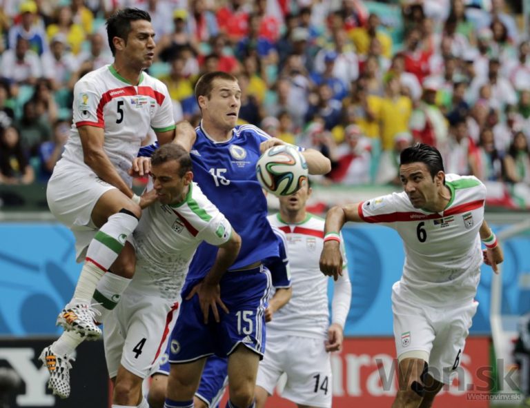 Futbalista Bosny a Hercegoviny Toni Sunjič v súboji s iránskymi futbalistami počas stredajšieho zápasu F-skupiny na svetovom šampionáte v Brazílii. Foto: SITA/AP