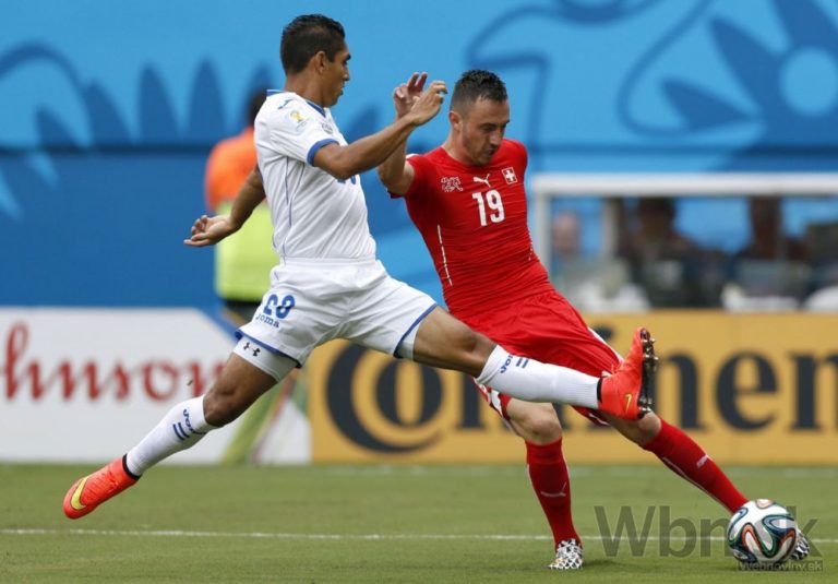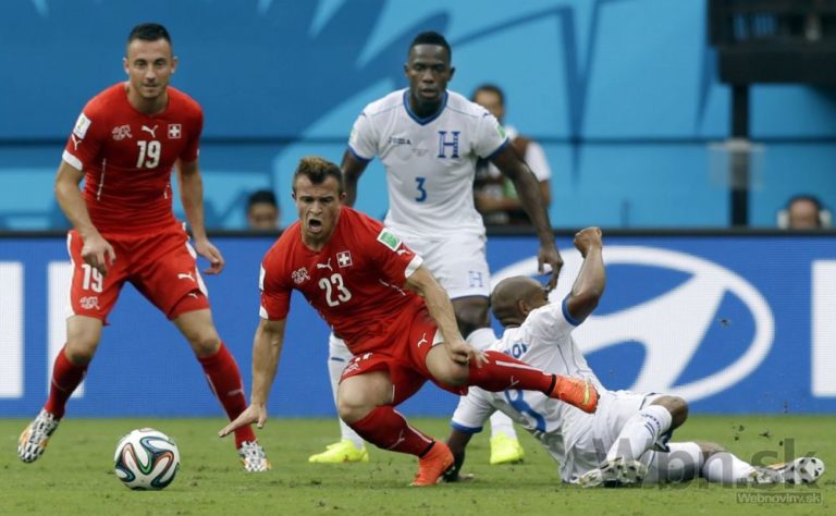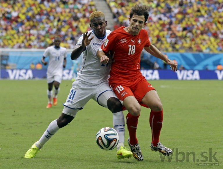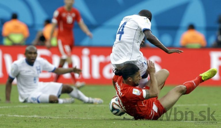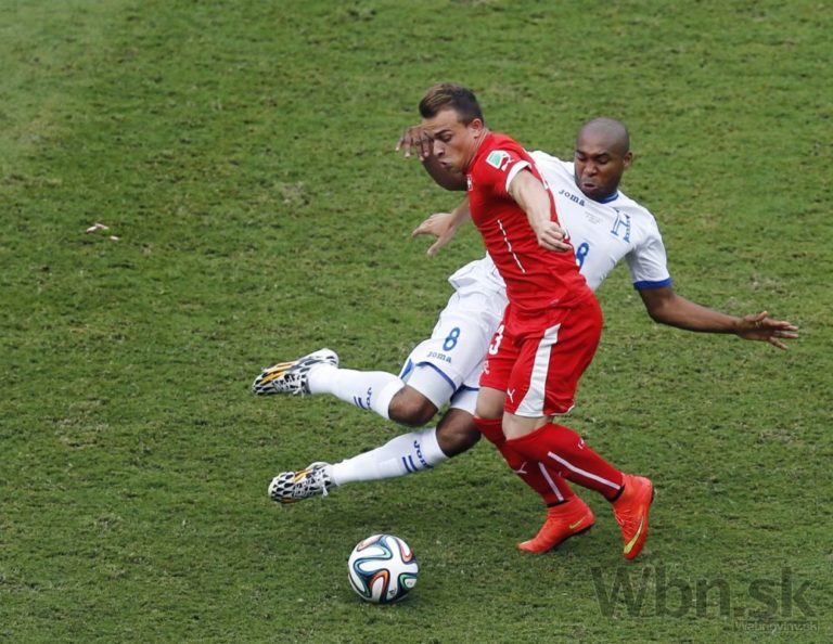 Honduraský futbalista Wilson Palacios v súboji so Švajčiarom Xherdanom Shaqirim (23) počas stredajšieho zápasu E-skupiny na svetovom šampionáte v Brazílii. Foto: SITA/AP