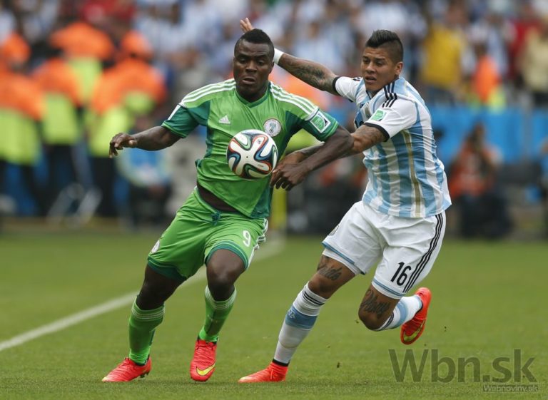 Nigérijčan Emmanuel Emenike v súboji s argentínskym futbalistom Marcosom Rojom počas stredajšieho zápasu F-skupiny na svetovom šampionáte v Brazílii. Foto: SITA/AP