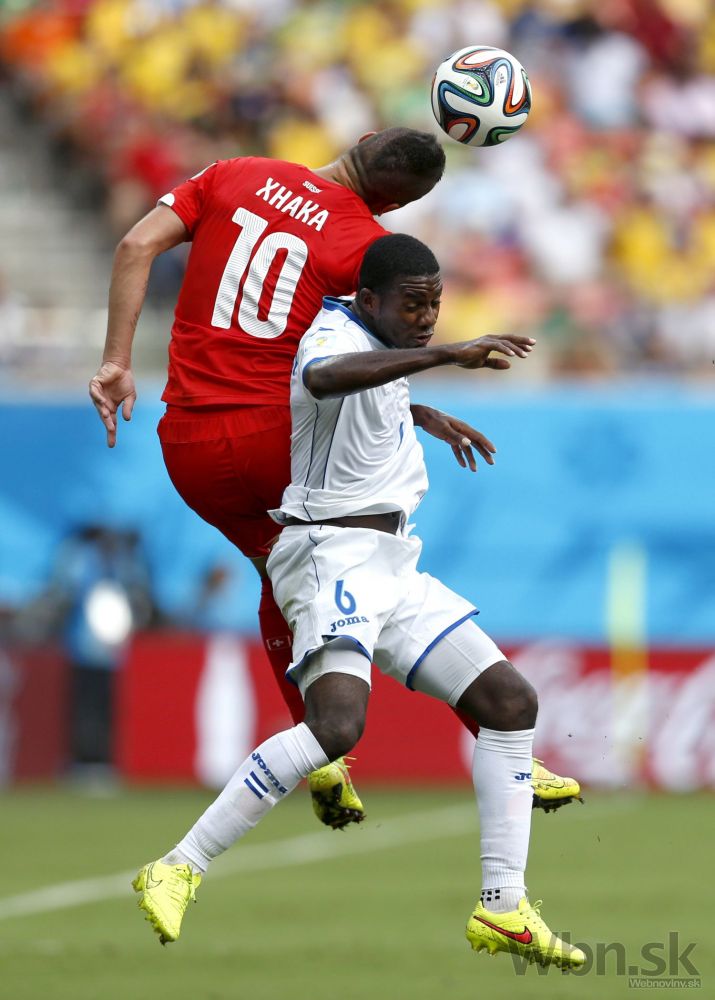 Futbalista Hondurasu Juan Carlos Garcia (6) v hlavičkovom súboji so Švajčiarom Granitom Xhakom (10) počas stredajšieho zápasu E-skupiny na svetovom šampionáte v Brazílii. Foto: SITA/AP