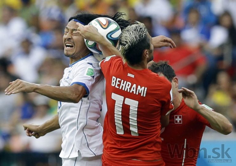 Futbalista Hondurasu Roger Espinoza v hlavičkovom súboji so švajčiarskymi futbalistami Valonom Behramim a Stephanom Lichtsteinerom počas stredajšieho zápasu E-skupiny na svetovom šampionáte v Brazílii. Foto: SITA/AP