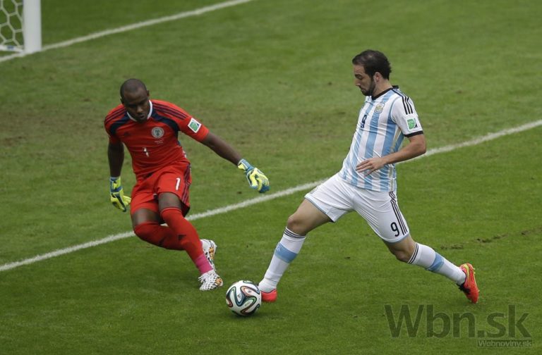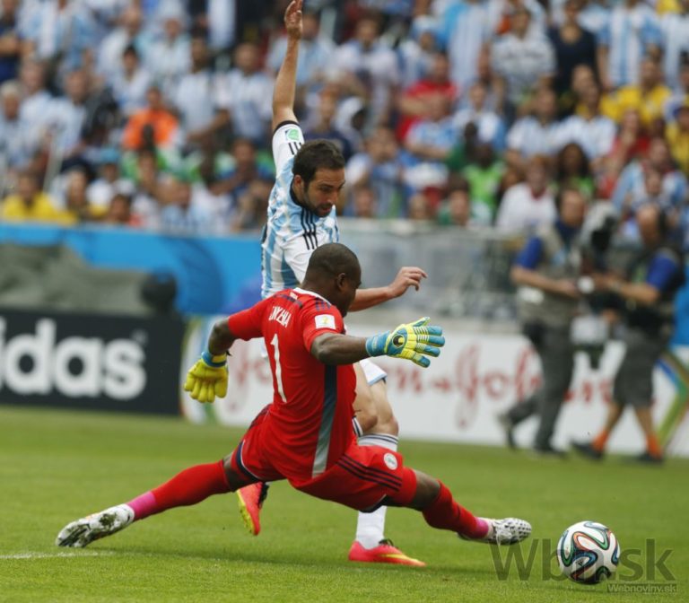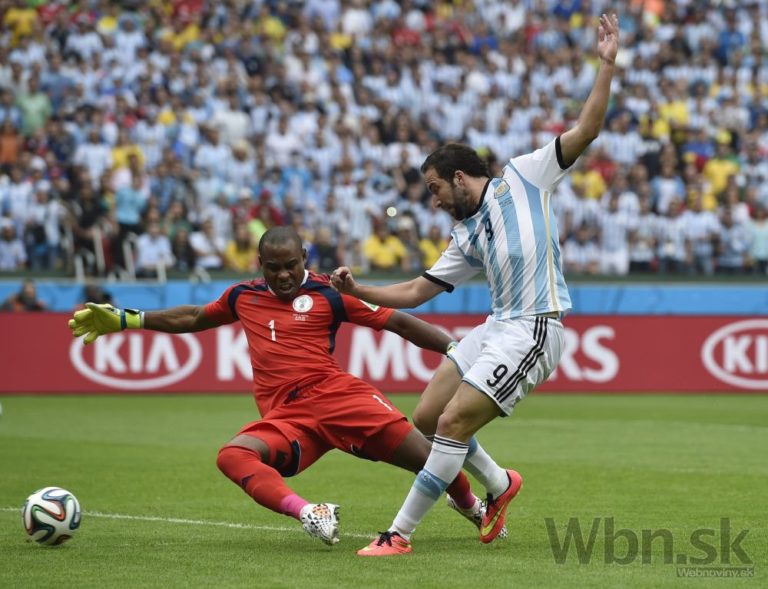 Argentínčan Gonzalo Higuain sa snaží prekonať nigérijského brankára Vincenta Enyeamu počas stredajšieho zápasu F-skupiny na svetovom šampionáte v Brazílii. Foto: SITA/AP