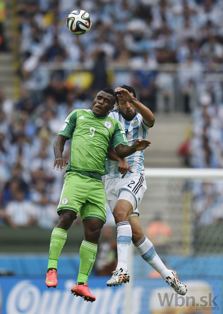 Nigérijčan Emmanuel Emenike v hlavičkovom súboji s argentínskym futbalistom Ezequielom Garayom počas stredajšieho zápasu F-skupiny na svetovom šampionáte v Brazílii. Foto: SITA/AP