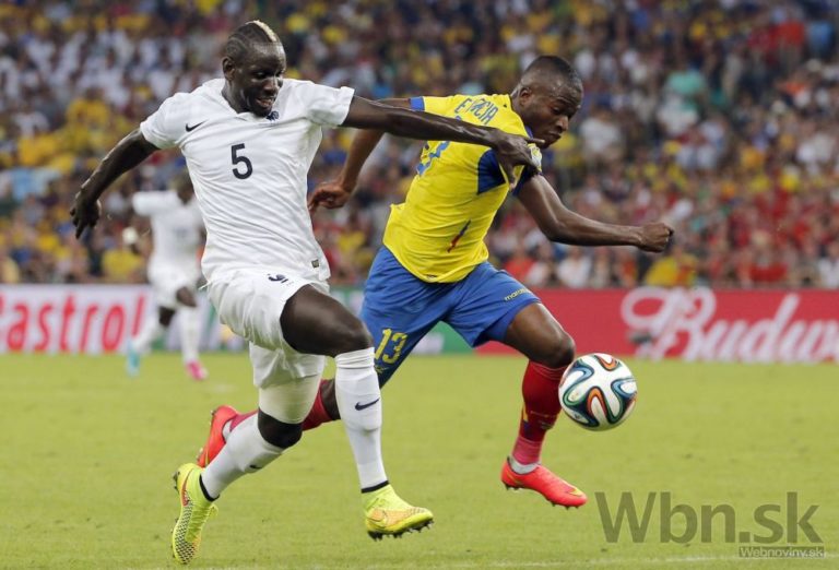 Francúz Mamadou Sakho v súboji s ekvádorským futbalistom Ennerom Valenciom počas stredajšieho zápasu E-skupiny na svetovom šampionáte v Brazílii. Foto: SITA/AP