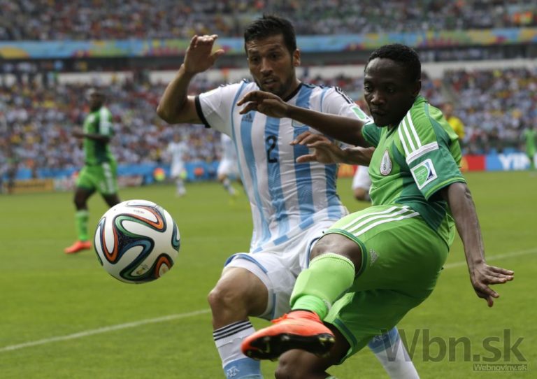 Nigérijčan Ahmed Musa v súboji s argentínskym futbalistom Ezequielom Garayom počas stredajšieho zápasu F-skupiny na svetovom šampionáte v Brazílii. Foto: SITA/AP