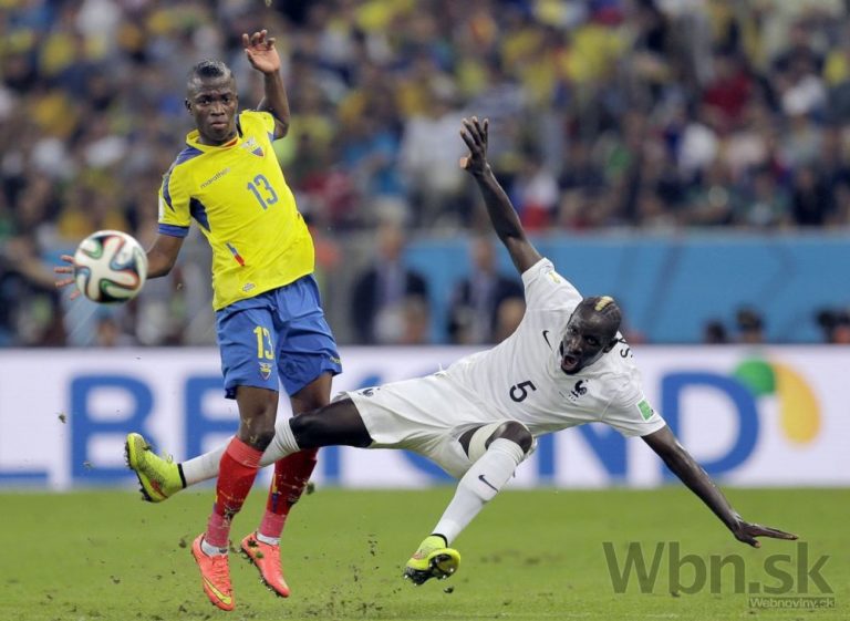 Francúz Moussa Sissoko v súboji s ekvádorským futbalistom Walteomr Ayovim počas stredajšieho zápasu E-skupiny na svetovom šampionáte v Brazílii. Foto: SITA/AP