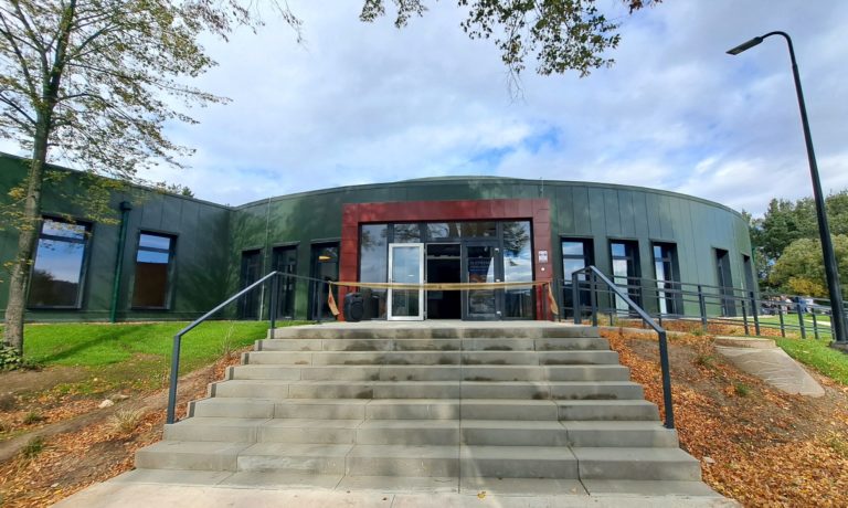 Budova Strednej odbornej školy (SOŠ) agropotravinárskej a technickej v Kežmarku, vpravo nové výcvikové stredisko -minifarma. Kežmarok, 22. septembra 2023. Foto: SITA/Mária Frisová.