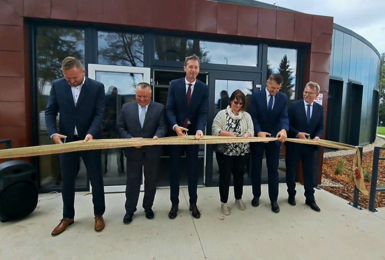 Slávnostné otvorenie novej minifarmy Strednej odbornej školy (SOŠ) agropotravinárskej a technickej v Kežmarku. Zľava: Zhotoviteľ stavby Štefan Olejník, riaditeľ školy Stanislav Marhefka, predseda Prešovského samosprávneho kraja Milan Majerský, expertka Svetovej banky Helena Virčíková, podpredseda Prešovského samosprávneho kraja Štefan Bieľak a vedúci odboru školstva PSK Ján Furman. Kežmarok, 22. septembra 2023. Foto: SITA/Mária Frisová.