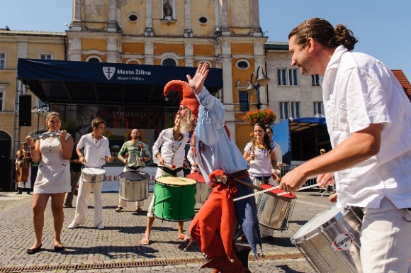 Podujatie VI. Stredoveký deň v Žiline otvoril mím Miro Kasprzyk spolu s hudobným zoskupením CAMPANA BATUDACA. Foto: SITA/Milo Fabian