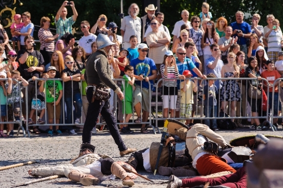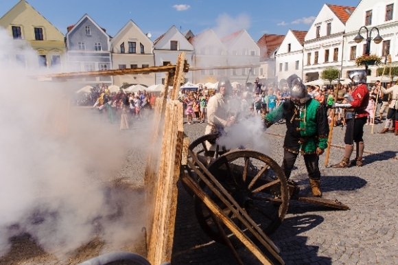 Slávnostný výstrel z dela otvoril prvú stredovekú bitku na Mariánskom námestí počas podujatia VI. Stredoveký deň. Foto: SITA/Milo Fabian