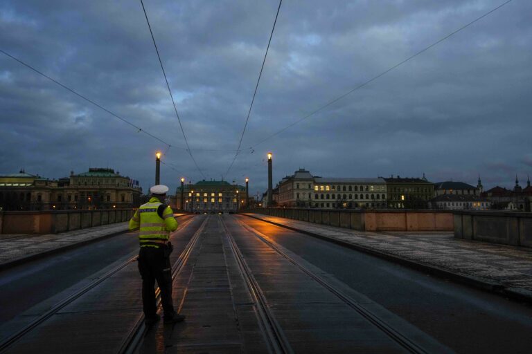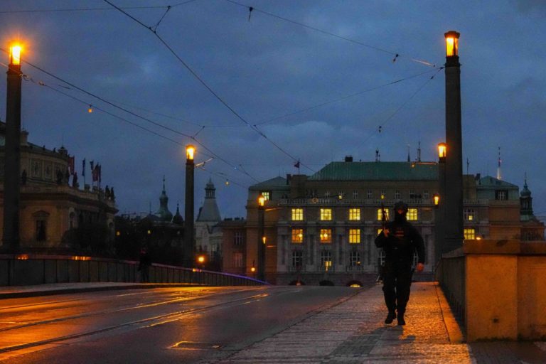 Policajt hliadkuje na moste cez rieku Vltava neďaleko Filozofickej fakulty Karlovej univerzity v Prahe, kde došlo k streľbe s niekoľkými mŕtvymi a zranenými. Praha, 21. december 2023. Foto: SITA/AP