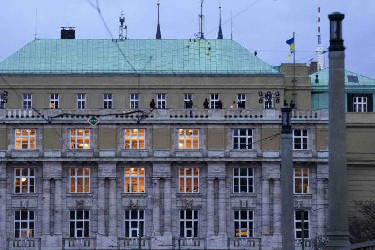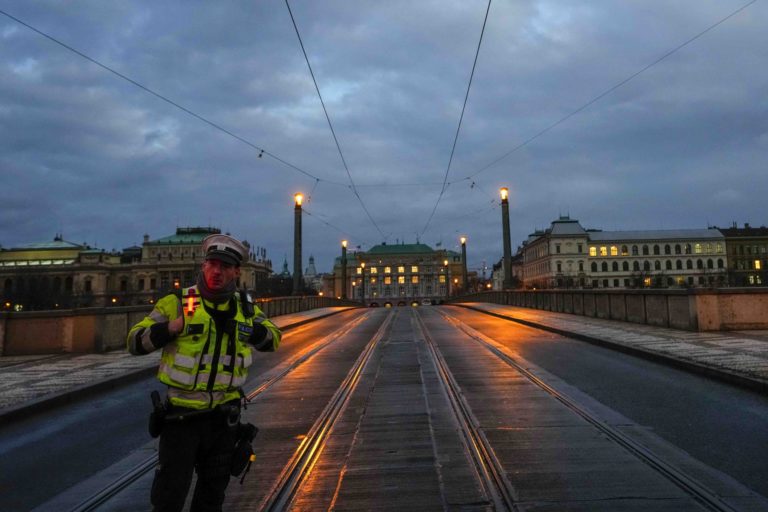 Policajt hliadkuje v okolí budovy Filozofickej fakulty Karlovej univerzity v Prahe, kde sa odohrala streľba, ktorá si vyžiadala niekoľko mŕtvych a zranených. Praha, 21. december 2023. Foto: SITA/AP