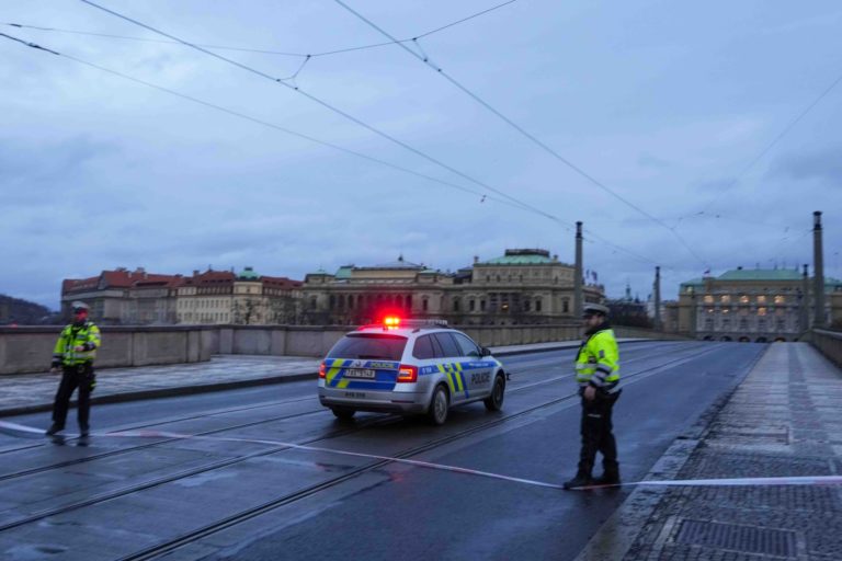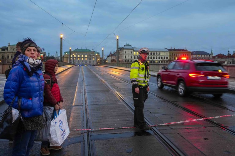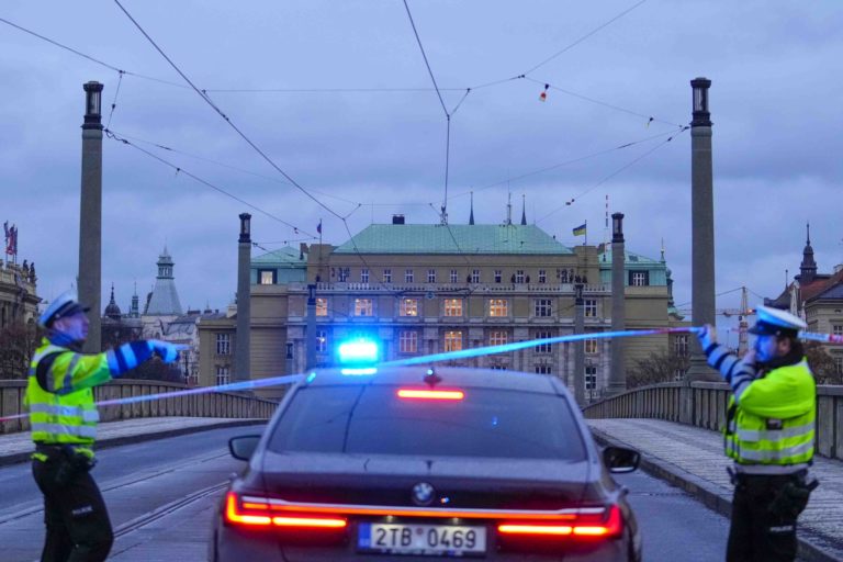 Polícia zabezpečuje oblasť pri budove Filozofickej fakulty Karlovej univerzity v Prahe, kde sa odohrala streľba, ktorá si vyžiadala niekoľko mŕtvych a zranených. Praha, 21. december 2023. Foto: SITA/AP